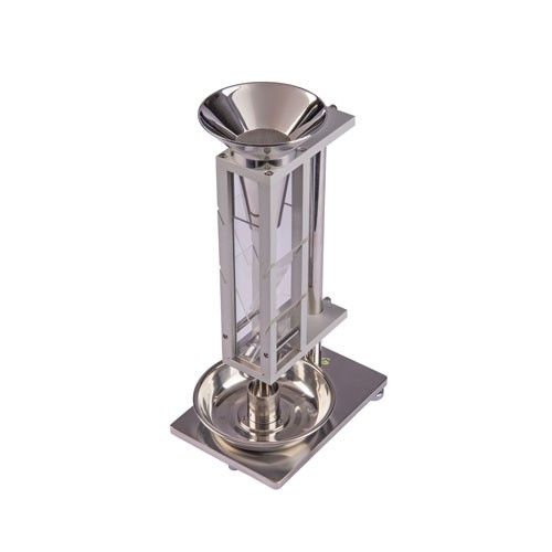 粉末放入上部组合漏斗中的筛网上,自然或靠外力流入布料箱,交替经过布料箱中的四块倾斜角为25°的石英玻璃板和方形漏斗,最后流入已知体积的圆柱杯中,呈松散状态。然后称量圆柱杯中的粉末的质量。